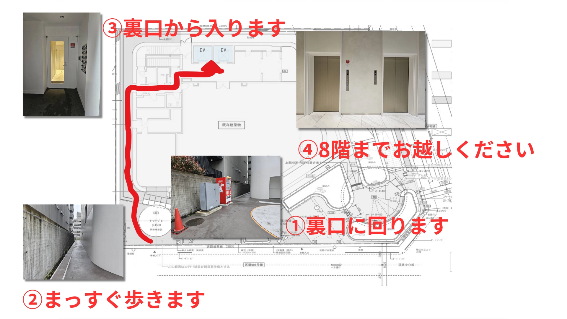 ビルのメインエントランスが閉まっていますので、ビルの裏口からお入りいただくようにお願いします。